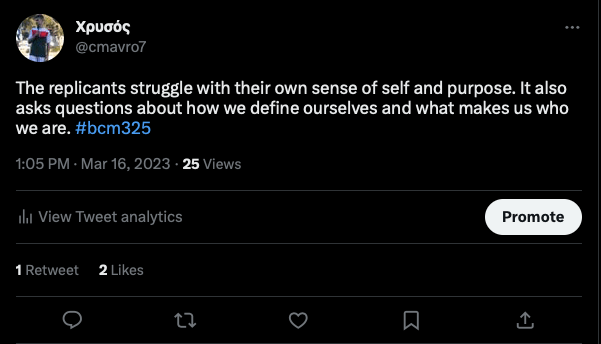 The film that struck the most to me, was the Blade Runner. Especially when it comes to their replicants and their interpretations on the world. The replicants themselves corroborate the idea of cybernetics through the control and communication of the replicants and Sci-Fi. G. Bruno indicates that if a machine can feel emotions and talk like them, that is the main sign of a human in Sci-Fi. A key emotion within the world is how us humans identify and belong within an environment, which was something that I thought is crucial for the replicants within the movie. That feeling is something even seen by humans, and so it rang the question, is AI becoming more and more human and are humans becoming less human? This idea was discussed immensely within the live tweeting session, especially the correlation of cybernetics.
